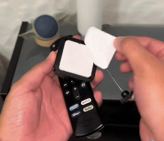 Befestigen Sie das Kabelende am gewünschten Objekt, beispielsweise an einer Fernbedienung. Der Klebestreifen am Kabelende ist leicht biegsam und eignet sich daher für die Verwendung mit Objekten unterschiedlicher Form.